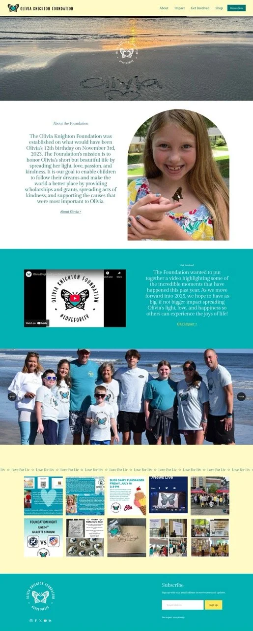 To honor Olivia’s legacy, I designed and built a custom website that supports the Foundation’s mission of scholarship giving, kindness campaigns, and community storytelling. The site serves not only as an online focal point, but as a heartfelt tribute to Olivia’s generosity and spirit.